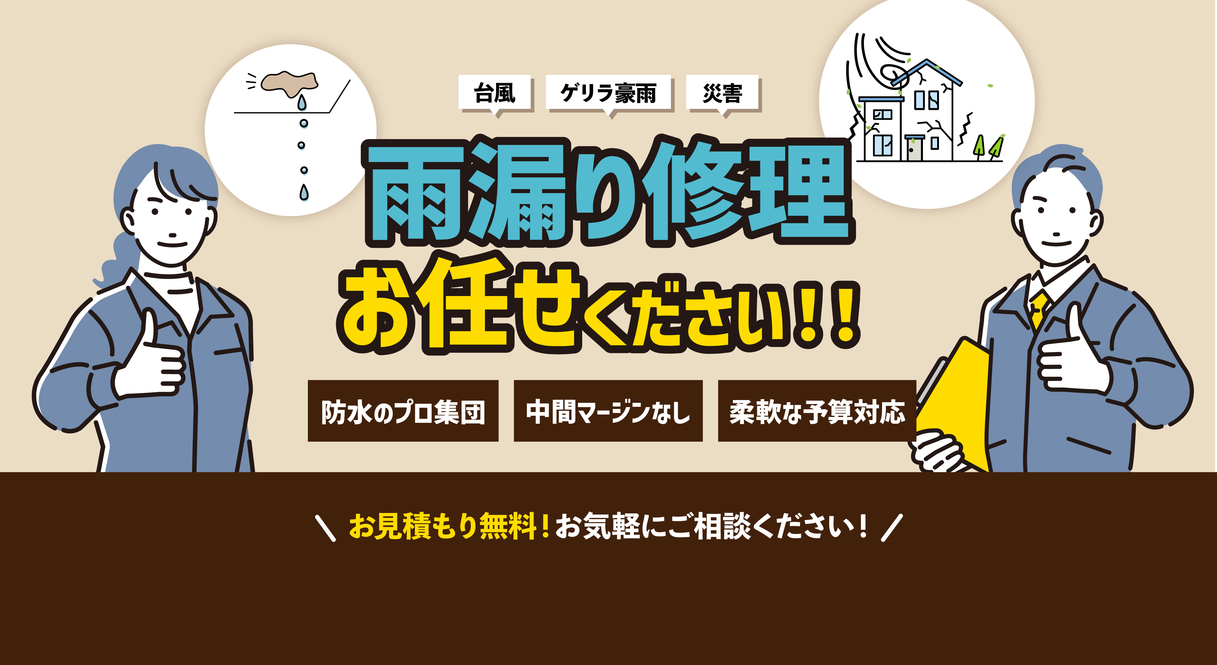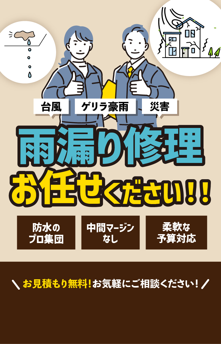 お客様のニーズや用途に合わせた最適な工事をご提案いたします。防水・塗装工事・雨漏り修理・屋根防水工事・ベランダ防水工事は、防水工事業者の当社へぜひご相談ください!