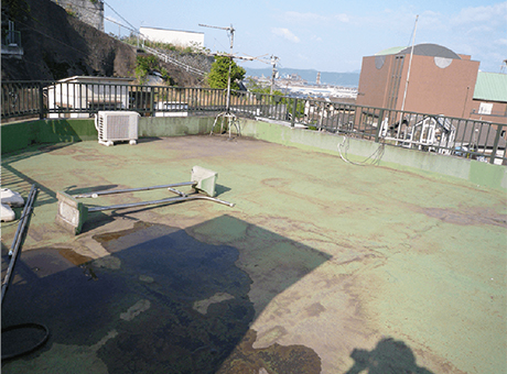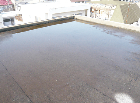 施工前は勾配が悪く水が溜まっていたので、モルタルにて不陸調整を行い、改質アスファルト防水・トーチ工法で防水改修を行いました。それにより水が溜まらなくなり仕上げの塗料に遮熱タイプを使用しているため、断熱効果も得られ環境にも配慮しています。