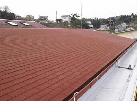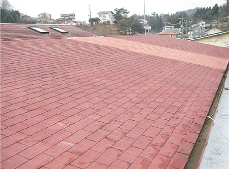 表面的には分からないのですが、屋根が漏水していたので古い屋根の上から下地処理をして、葺き替えをしました。古い屋根の上から施工しているので、施工中に漏水する可能性が少なく、古い屋根材を撤去しないので廃材処分費も発生しておりません。